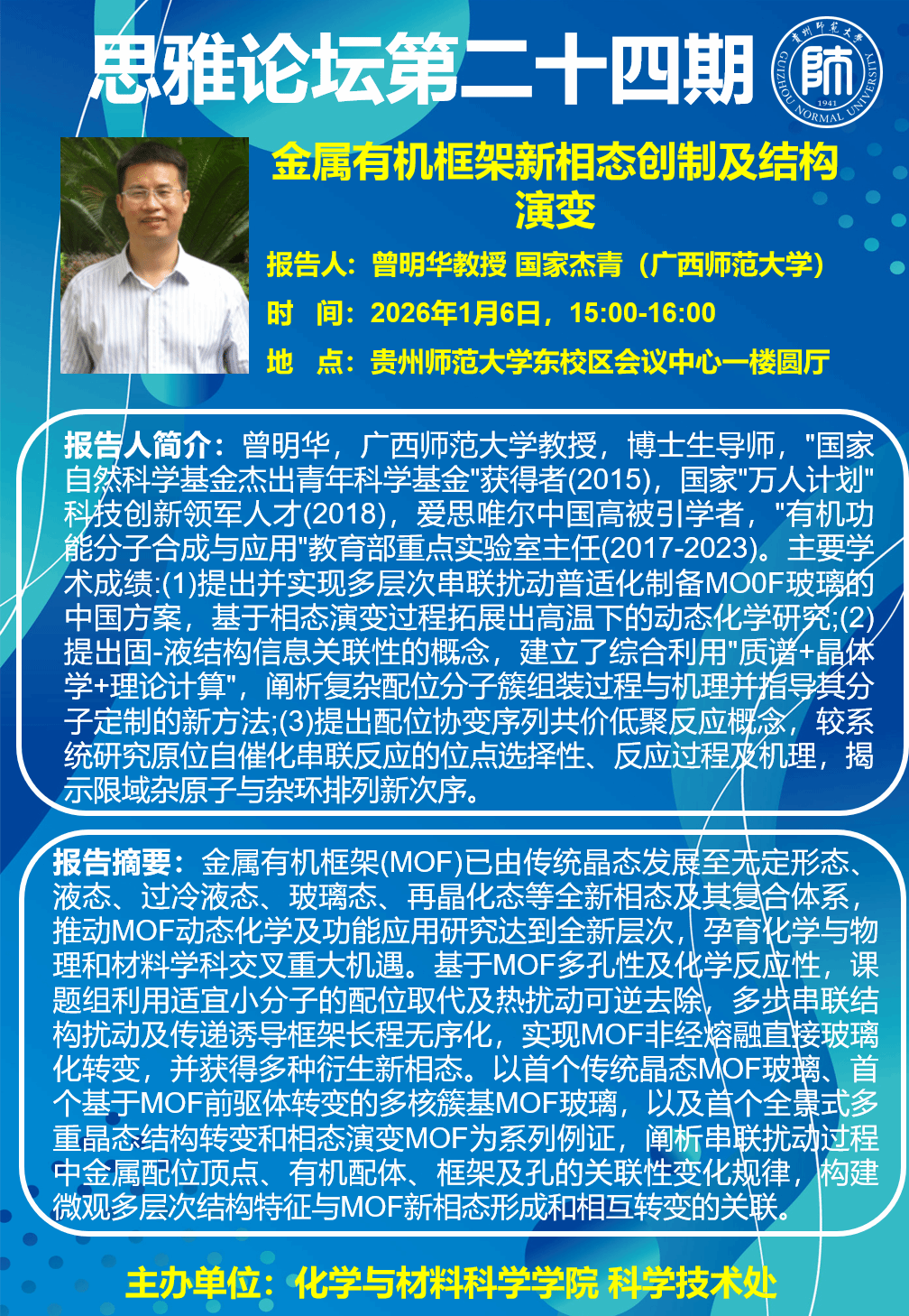 为团结引领我校科技工作者聚焦我省“四区一高地”主定位,围绕“四新”主攻“四化”主战略,助推“六大产业基地”建设工作,营造平等求真的学术环境和交流氛围,发挥学术交流在推动科技创新、带动学科发展、助力人才成长的积极作用,化学与材料科学学院、科学技术处特邀请国家杰青曾明华教授到我校开展专题讲座。现将活动安排通知如下: